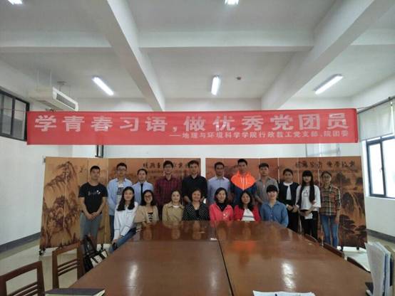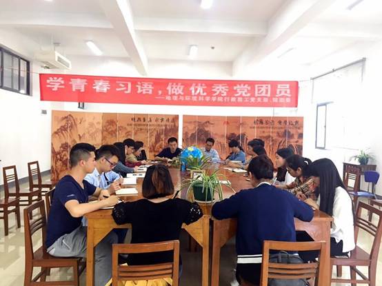 5月9日下午,由bat365登录平台入口教工行政党支部与院团委联合举办的“学青春习语,做优秀党团员” 主题读书分享会活动启动仪式在地环学院四楼图书室开展。学院党委书记杨建红、教工行政党支部教师及学生党员、团员代表共20余人参加。活动由教工行政党支部书记胡丰青主持。