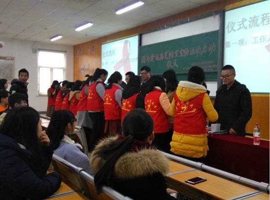 仪式上,工作人员首先为嘉宾和老师们系上了代表着关心、希望和支持的红丝带,寓意将大家紧紧联系在一起,共同抗击艾滋病。