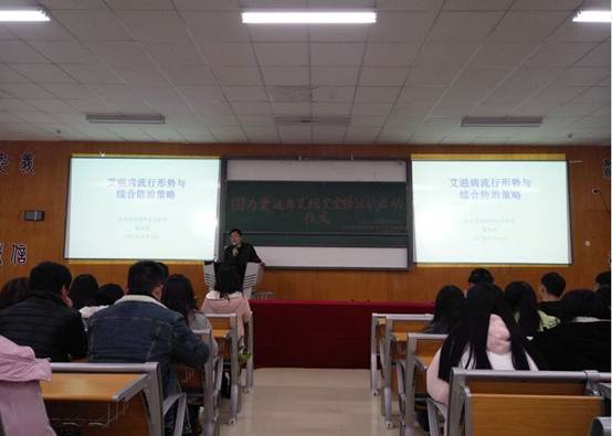 启动仪式后,姚永明为在场师生开展了艾滋病防治专题讲座。他首先就艾滋病流行概况,从艾滋病患者的年龄、比例、传播方式等方面进行了介绍,并利用大数据分析了艾滋病的高危人群和其传播途径,纠正同学们错误的艾滋病知识;解释了艾滋病“三四五”概念,即三种传播方式,艾滋病传播必须同时满足的四个条件以及五种危险体液;就“三四五”相关问题为同学们分析讲解艾滋病的预防和防治工作,并号召同学们要树立正确价值观,加强对艾滋病的认识,消除对艾滋病人的歧视,提高自我防卫能力的心理和行为措施,科学的预防艾滋病的感染。