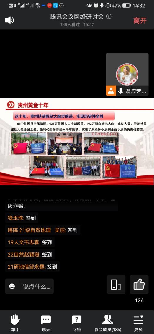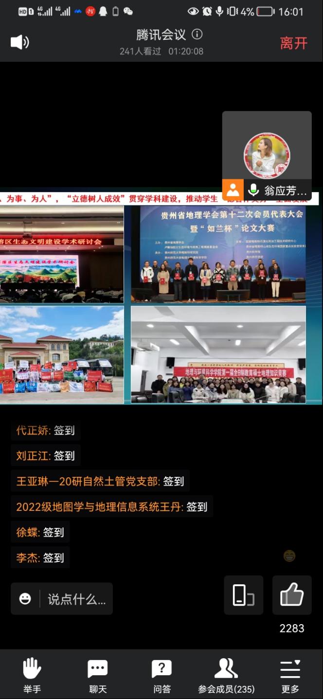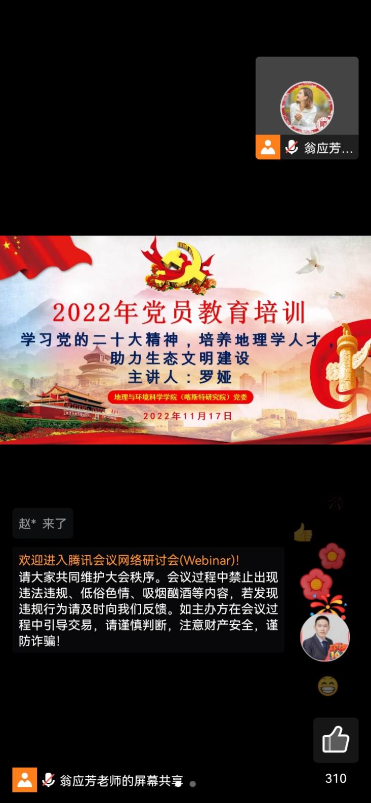 2022年11月17日,由院党委委员罗娅老师以“学习党的二十大精神,培养地理学人才,助力生态文明建设”为主题展开。罗娅老师带领大家学习了党的二十大会议主题以及大会关于生态文明建设的论述,介绍了中国生态文明建设取得的成就和案例,分析了地理学为生态文明建设的可能贡献,最后提出地理学人才培养改进措施。通过本次学习,与会党员对党的二十大中关于生态文明建设的论述有了更进一步认识,同时激发了学生党员对地理学为生态文明建设的可能贡献的思考,加深了教师党员对地理学人才培养国家需求的理解与认同。