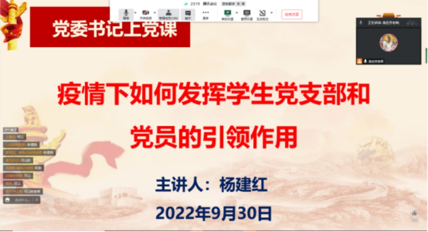 2022年9月30日,由院党委书记杨建红以“疫情下如何发挥学生党支部和党员的引领作用”为主题展开,从“重大疫情类突发事件概述”“突发事件对大学生的影响”“突发事件对学生党支部的考验”“高校学生党支部的时代价值与作用”“突发事件下学生党支部的引领作用”五个方面向学生党员娓娓道来,列举了疫情中学校学院的很多志愿者和全心全意为同学们服务的党员事迹,要求广大学生党员,在重大疫情类突发事件下要发挥学生党支部的引领作用,带头服从学校管理、有序参与校园志愿者服务工作、自觉抵制违法违规行为以及意识形态、交通安全、心理健康等方面的安全,作为党员,要从“三个维度”“五个方面”发挥引领作用,以点燃学生的奋斗之火、努力之源,真正锻造成为能够担当民族复兴重任的时代新人。