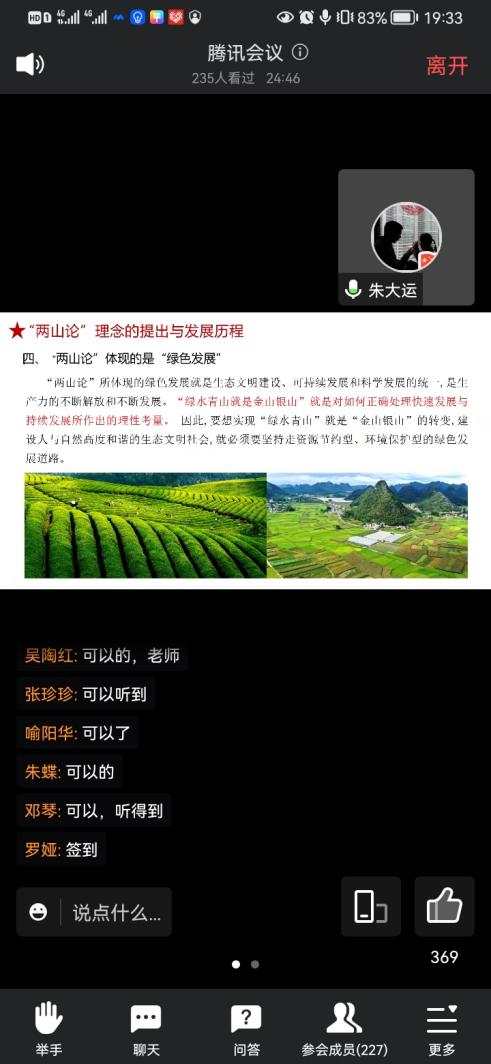 2022年11月22日,由副院长朱大运老师以“守护绿水青山,科技服务生态文明建设”为主题展开。朱大运老师从党的二十大中“绿水青山就是金山银山”即“两山论”讲起,到贵州省的生态方面的政策解读,再到良好的生态环境与民生福祉的关系等方面着眼,讲述极多破坏生态环境的案例,并以黄土高原生态修复奇迹、内蒙古库布齐沙漠的沙漠变绿洲奇迹、贵州石漠化治理创造的花江模式、易地扶贫搬迁等讲述以破坏生态环境为代价的发展到科技服务生态文明建设的过程。朱老师运动习近平生态文明思想出发,很好地分析清楚了绿水青山与金山银山之间的关系。