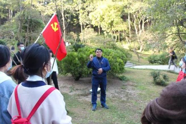 启动仪式结束后,所有人员集中乘车前往黔灵山,参观麒麟洞爱国主义教育基地。参观过程中,2019级研究生第二党支部学生党员李文芳为大家讲解了“西安事变”的经过和两位爱国将领张学良、杨虎城被关押的情况。登黔灵山的沿途中,陈浒教授、刘子琦副教授、狄永宁副教授以及喻阳华副教授通过对黔灵山地质地貌的实地考察,为同学们讲解了有关岩石构造以及地下水的分布情况。全体师生抵达英雄纪念碑后在黔灵湖英雄纪念碑开展了相关纪念活动。
