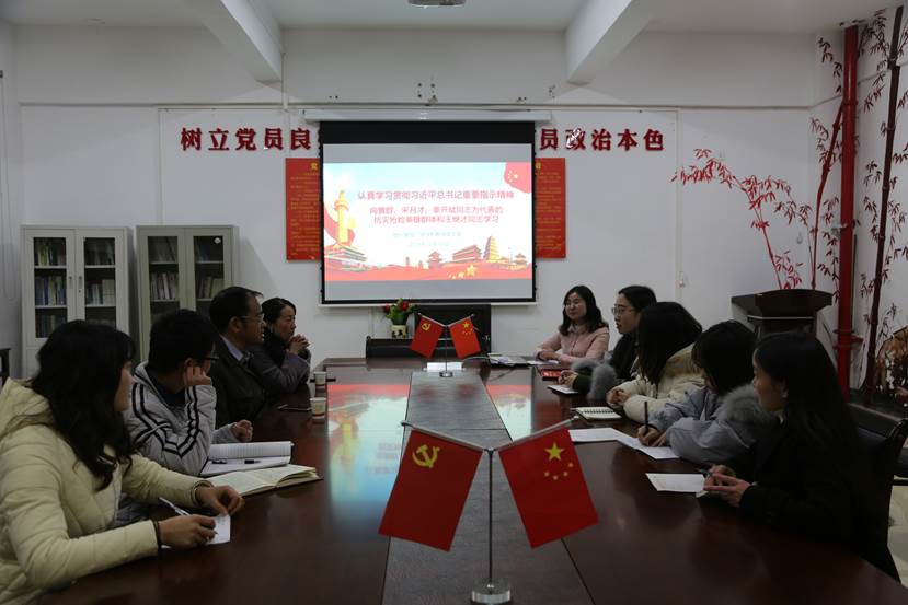 会议伊始,杜国鑫带领支部党员学习了黄群、宋月才、姜开斌、王继才4位同志的先进事迹。其中黄群、宋月才、姜开斌3位同志面对台风和巨浪,挺身而出、英勇无惧,为保护国家重点试验平台壮烈牺牲,用实际行动诠释了共产党员对党忠诚、恪尽职守、不怕牺牲的优秀品格;王继才同志守岛卫国,用无怨无悔的坚守和付出,在平凡的岗位上书写了不平凡的人生华章。她要求支部党员要学习4位同志信仰坚定、对党忠诚的政治品格,恪尽职守、担当有为的敬业精神以及甘于奉献、勇于牺牲的崇高境界,不忘初心、忠诚于事业。