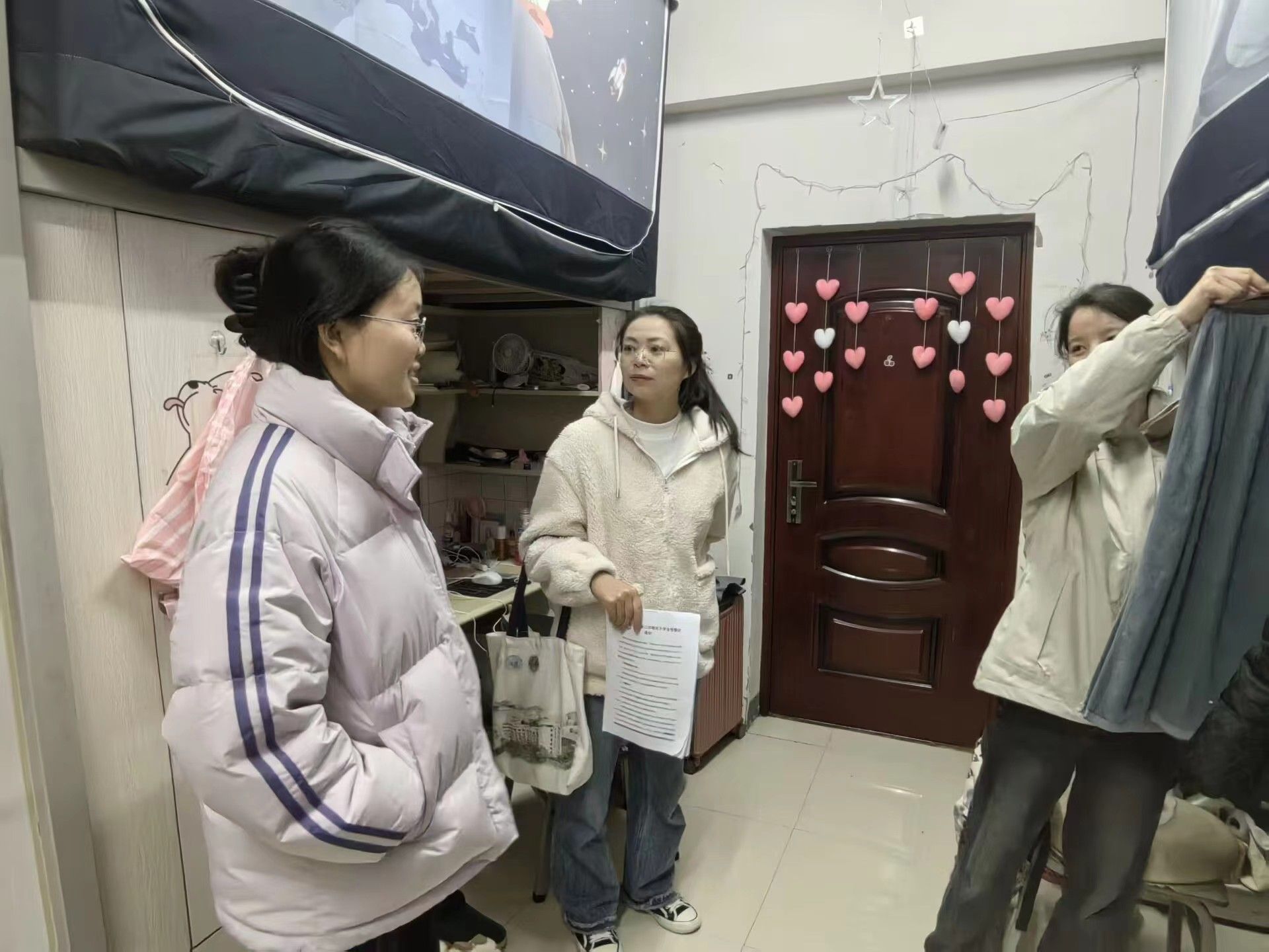 走访过程中,老师与学生们亲切交谈,提醒同学们新学期已经开始,新的规划指引新的方向与成长,希望大家及时收心,把精力放到提升自我上来。宿舍是大家学习、娱乐、休整的场所,爱护寝室,团结室友,遵守宿舍管理规定是每个人的责任与义务,希望同学们用真心换真情,打造和谐温馨的寝室环境。
